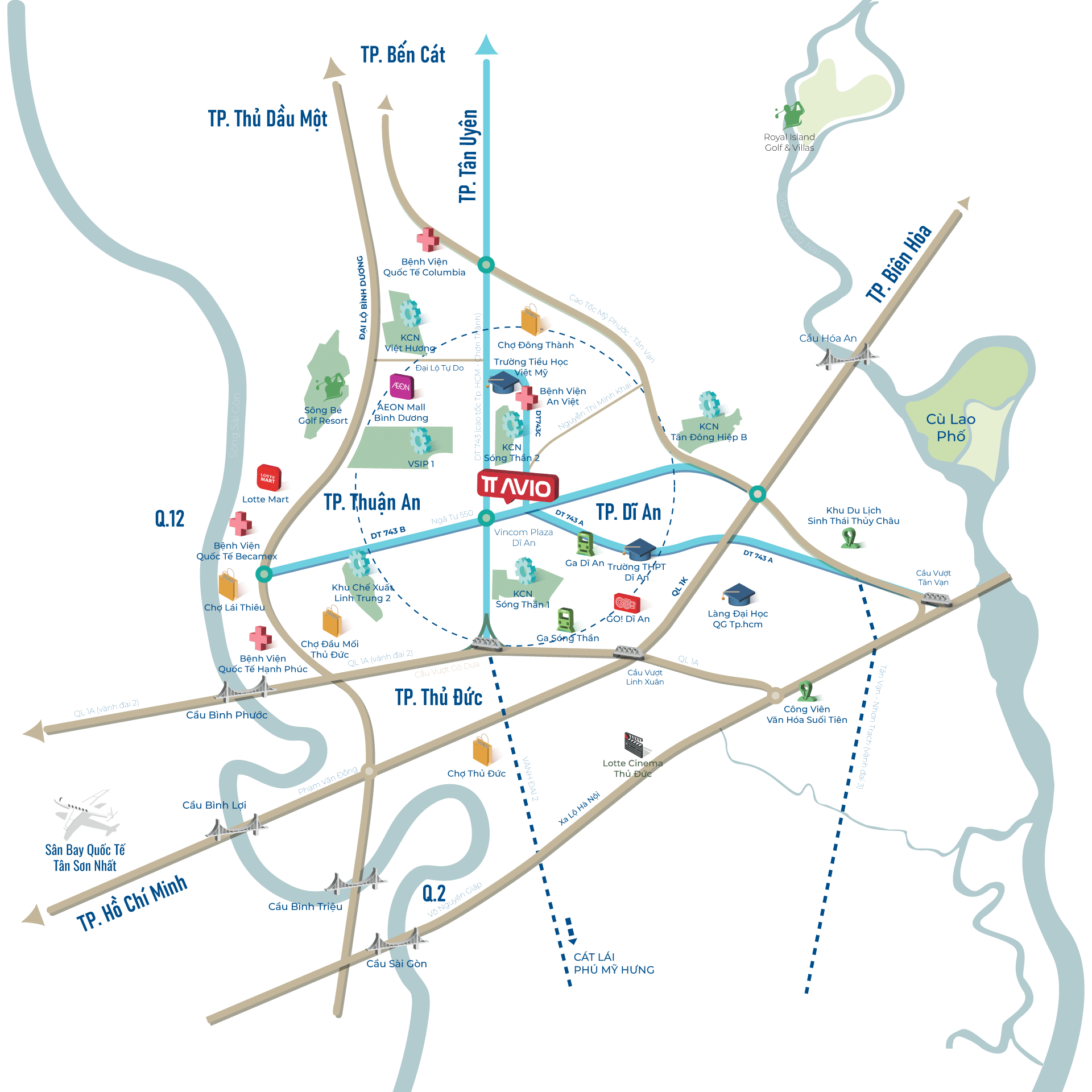 TT AVIO nằm mặt tiền đường DT743C, phường Tân Đông Hiệp, TP Dĩ An, thuộc khu dân cư hiện hữu, bao quanh là những tuyến đường như: Mỹ Phước – Tân Vạn, DT743 kết nối vành đai 2 và vành đai 3, Đại lộ Phạm Văn Đồng, tuyến Metro số 1 và số 3 kéo dài….